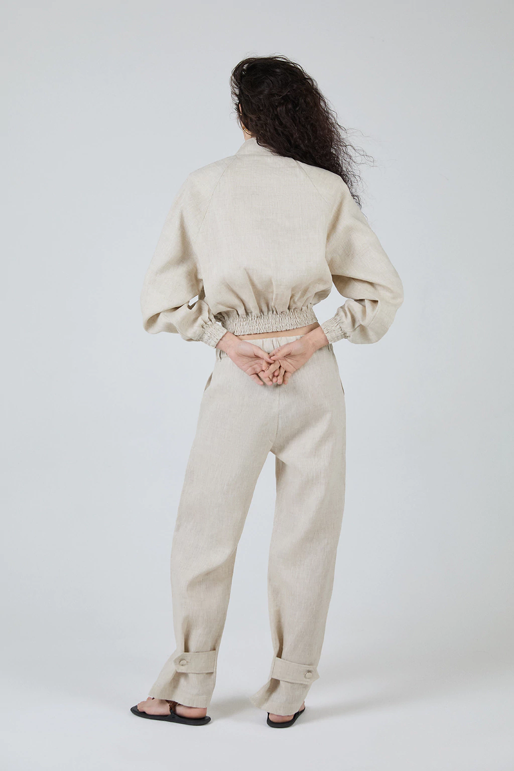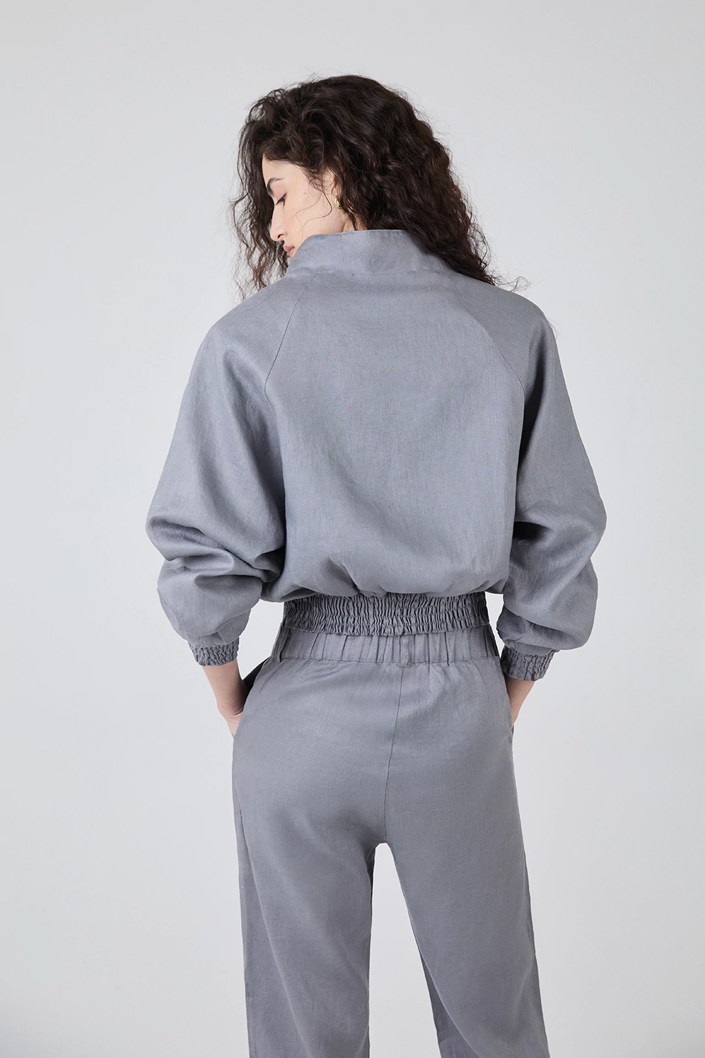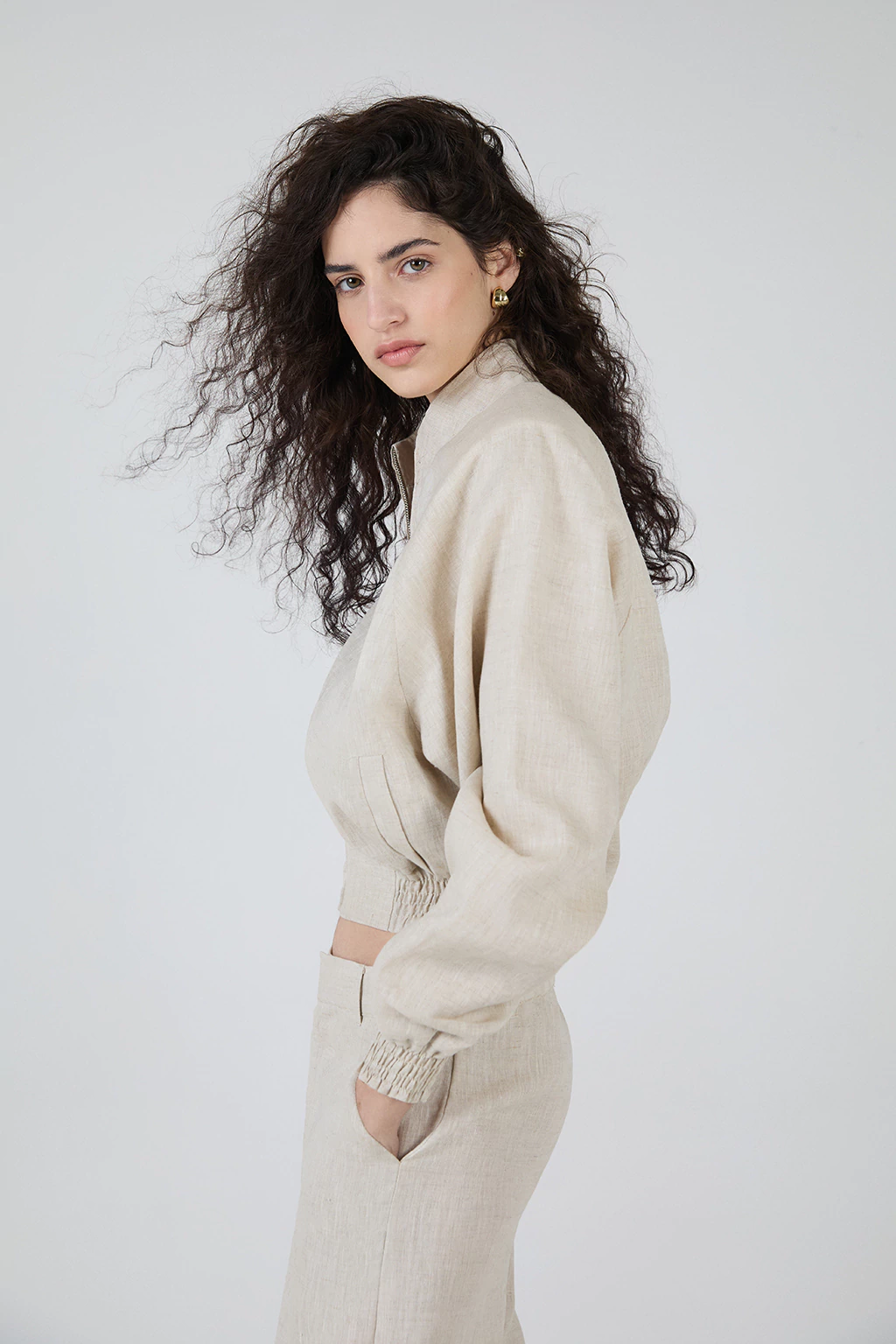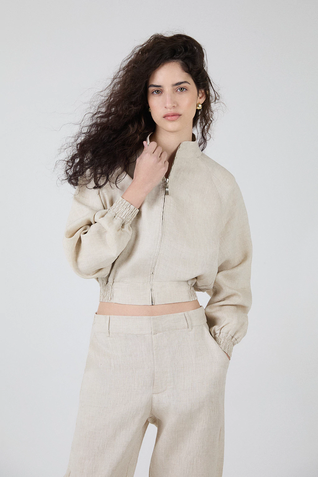 Campera bomber de lino con elastico y frunces en las mangas y la cintura. Viene en color beige y gris.